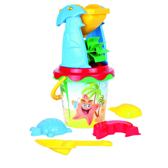 Sada hraček na písek vyrobena z kvalitního a pevného materiálu. Hraní na pískovišti a stavění báboviček zajistí dětem mnoho hodin zábavy. Tyto hračky dokonale podporují kreativitu, fantazii a soustředění dítěte. Sada je balená v síťce. Obsah sady: barevný kyblík s dětským motivem, mlýn, sítko, lopatka, 3 bábovičky.