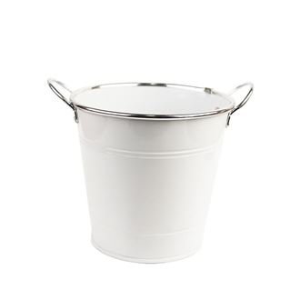 Kovový obal. Rozměry : průměr 16 cm, výška 14,5 cm. S ušima výška 16,5 cm. Barva : bílá. Materiál : kov. pročitati sve