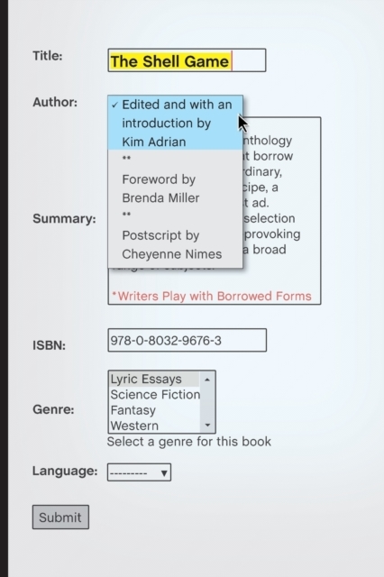 Within the recent explosion of creative nonfiction, a new type of form is quietly emerging, what Brenda Miller calls ""hermit crab essays"". The Shell Game is an anthology of these intriguing essays that borrow their structures from ordinary, everyday sources: a recipe, a crossword puzzle, a Craig's List ad.