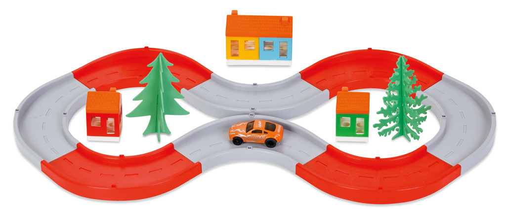 Silnice-autodráha menší o rozměrech 61 × 31 cm. Součástí balení autíčko na baterii, 3 domečky, stromky. pročitati sve